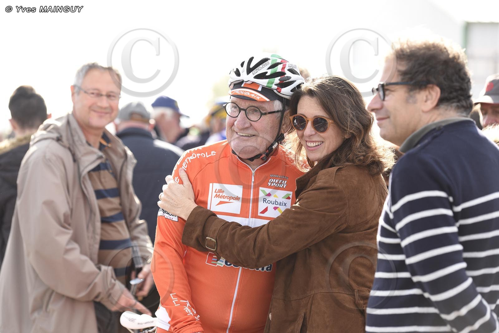 Cyril Guimard avec Valérie Fignon. A droite, le journaliste Patrick Chasse. CRITERIUM DES CHAMPIONS D'HIER 2016. Pipriac (35), le samedi 22 octobre 2016. Photo: © Yves MAINGUY